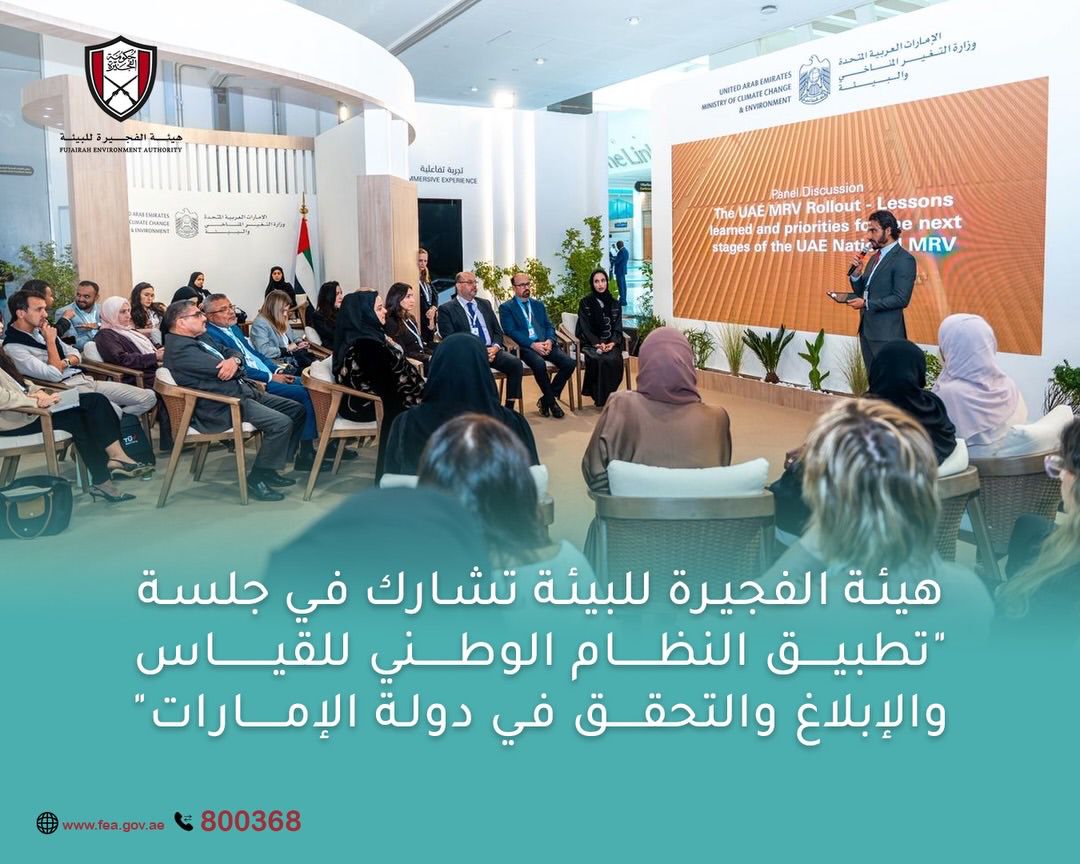 شاركت هيئة الفجيرة للبيئة في جلسة "تطبيق النظام الوطني للقياس والإبلاغ والتحقق في دولة الإمارات" والتي نظمتها وزارة التغير المناخي والبيئة بالتعاون مع المعهد العالمي للنمو الأخضر، وذلك في أعقاب ختام أسبوع أبوظبي للاستدامة 2026 والنسخة ال 18 من القمة العالمية لطاقة المستقبل. استعرضت الجلسة أبرز محاور السياق الوطني ومتطلباته التي ساهمت في تطوير المنصة الوطنية الموحدة وآلية الربط مع المنصات المحلية لرفع كفاءة المنظومة. كما ناقش فريق الهيئة أهدافه الاستراتيجية المُحَقَّقَة من خلال عملية الربط والتي توائم أهداف الأجندة الوطنية لجودة الهواء 2031، حيث عملت الهيئة خلال السنوات الماضية على مراقبة الأنشطة الصناعية بشكل متكامل يعزز من منظومتها الرقابية ويضمن امتثال المنشآت للقوانين والتشريعات البيئية بما بحقق أهداف التنمية المستدامة. وقدمت وزارة التغير المناخي والبيئة خلال الجلسة عرضاً حول الخطط المستقبلية لتوسيع نطاق عمل النظام.